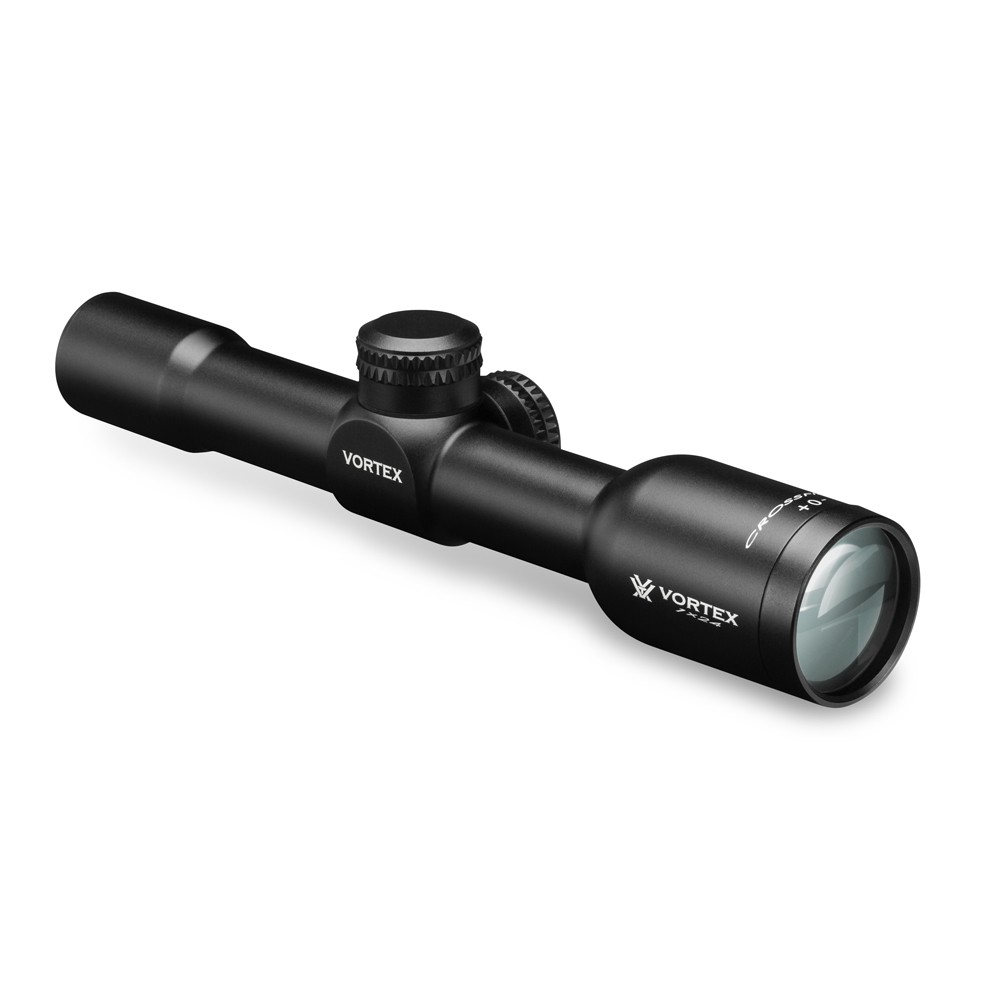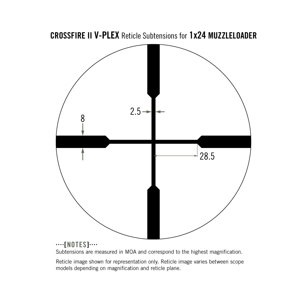 Our compact, rugged Crossfire II 1x Muzzleloader scope satisfies "no magnification" rules and provides a crystal-clear and ultra-bright unmagnified view. With generous 3.8 inches of eye relief and a vast, 95-foot field of view at 100 yards, the fully multi-coated optics and V-Plex reticle assure accurate shot placement in low light conditions.