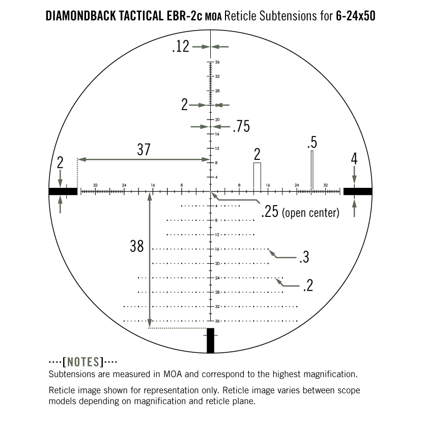Vortex presents affordable first focal plane (FFP) riflescopes. The first focal plane reticle, a feature ordinarily reserved for 4-figure-priced optics, allows shooters to use the information-packed EBR-2C reticles for ranging, holdovers or windage corrections on any magnification. Housed inside its durable, one-piece aluminum tube is a 4x optical system delivering excellent edge-to-edge clarity and sharp resolution. Exposed elevation and windage turrets are low profile enough to stay out of the way in packing situations, but offer the quickness, ease and precision of dialing accurate shots at distance. A side adjustable parallax gives shooters peace of mind by removing parallax error from the equation from 10 yards to infinity.