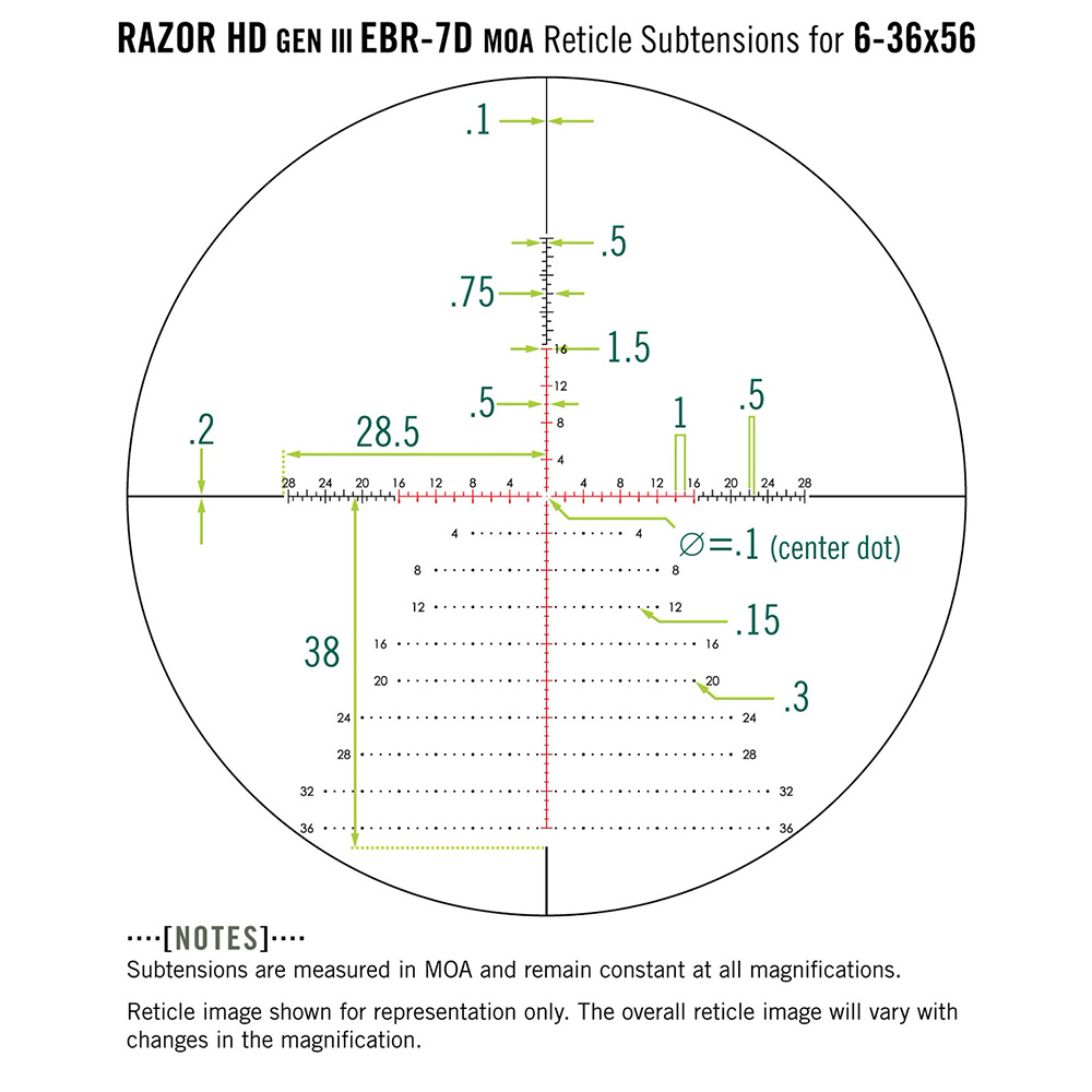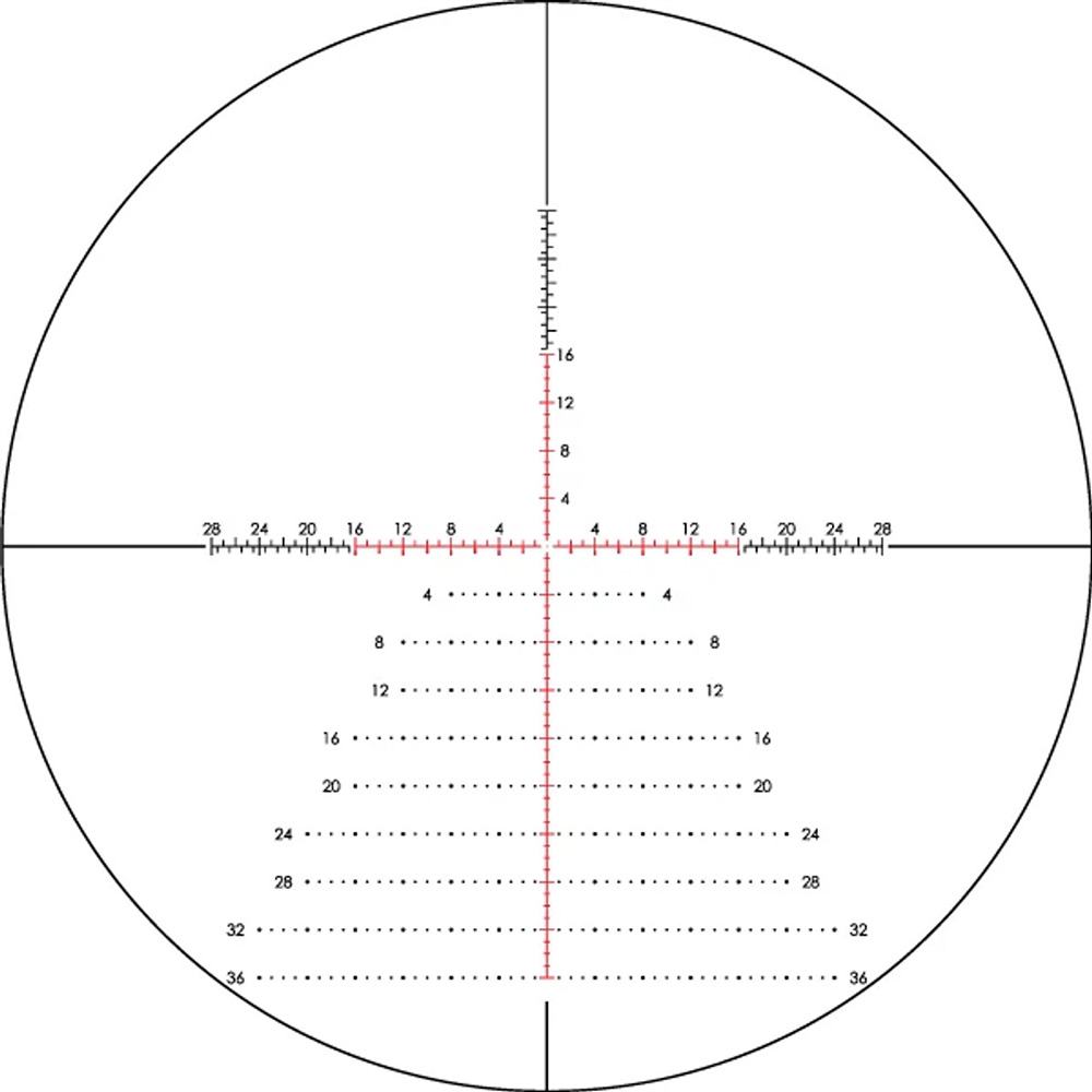 Scale of the EBR-7D reticle remains in proportion to the zoomed image. Constant subtensions allow for accurate holdovers and ranging at all magnifications while the EBR-7D reticle is useful for long-range shooting. |